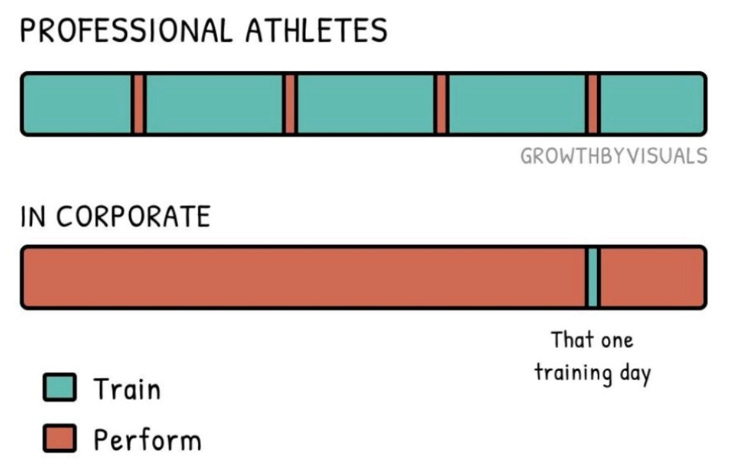Last week, whilst scrolling through LinkedIn, I came across this graphic, shared by Joseph Calabro, a Senior Financial Analyst. I don’t know anything about Joseph, or what Senior Financial Analysts do, but the image resonated. The top image describes how top athletes get better. Training is frequent, regular and lengthy in comparison to performance. By contrast, in the corporate world most of the time is spent ‘performing' i.e. doing the job, with irregular and short lived periods of training. This made me reflect on teacher professional development.